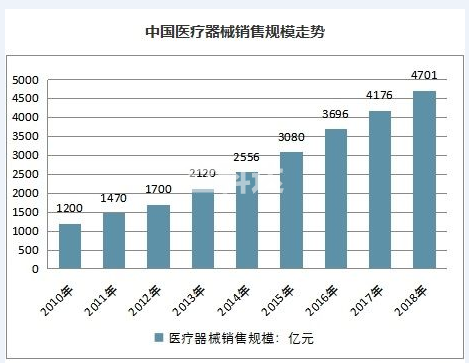 据前瞻产业研究院发布的《中国医疗器械行业战略规划和企业战略咨询报告》数据显示,2015年我国医疗器械市场总规模约为3080亿元,2015-2020年医疗器械市场将保持20%的增速。根据此增速测算,2016年中国医疗器械销售规模为3696亿元。截止到2017年中国医疗器械销售规模达到了4176亿元,预计2018年中国医疗器械销售规模将超4700亿元。